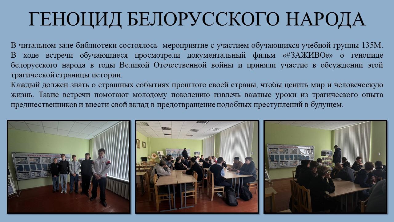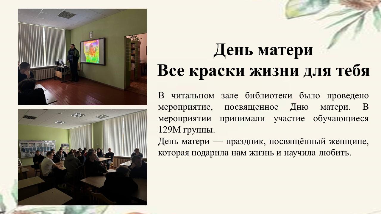 В читальном зале библиотеки было проведено мероприятие, посвященное Дню народного единства. В мероприятии принимали участие обучающиеся учебной группы 70Э, которыеучаствовали в викторине с вопросами по достопримечательностям нашей страны и в создании плаката «Прыгажосць зямлі маёй».