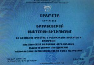 За активное участие в реализации проектов и программ Пуховичской районной организации общественного объединения «Белорусский республиканский союз молодежи» грамотой награждена Барановская Виктория Витальевна.