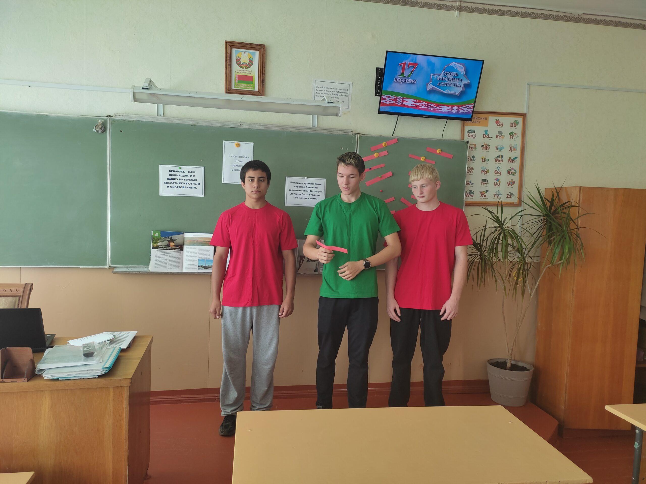 Активисты ПО ОО «БРСМ» провели диалоговую площадку «Мы одна страна». Рассмотрели историю создания праздника, ответили на вопросы викторины, дали определения понятиям «национальная гордость», «национальное достоинство». Заключительный этап проходил под девизом «Мой труд вливается в труд моей республики». Учащиеся обменялись мнениями по вопросу «Что я могу сделать для своей Родины, для людей Беларуси сейчас?».