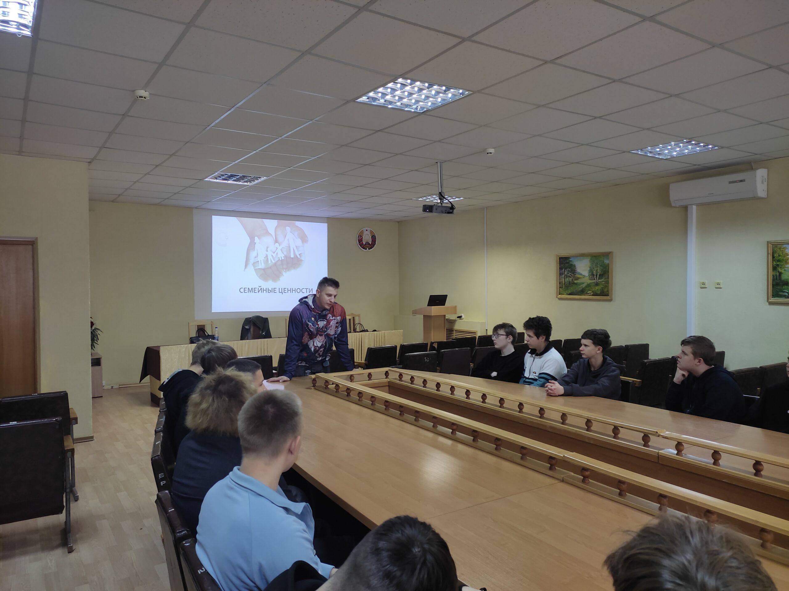 14 октября 2025 года секретарь первичной организации общественного объединения «Белорусский республиканский союз молодежи» Барановская Виктория Витальевна и Рулькевич Константин Александрович, активист ОО «БРСМ», ОО «Белая Русь», член Молодежного парламента при Минском областном исполнительном комитете провели для учащихся 72Э учебной группы круглый стол «Семейные ценности». Побеседовали о том, что такое семья, роли семьи в жизни человека, семейных ценностях. Порассуждали о секрете семейного счастья, а также поделились семейными традициями. Диалог получился живым и насыщенным.