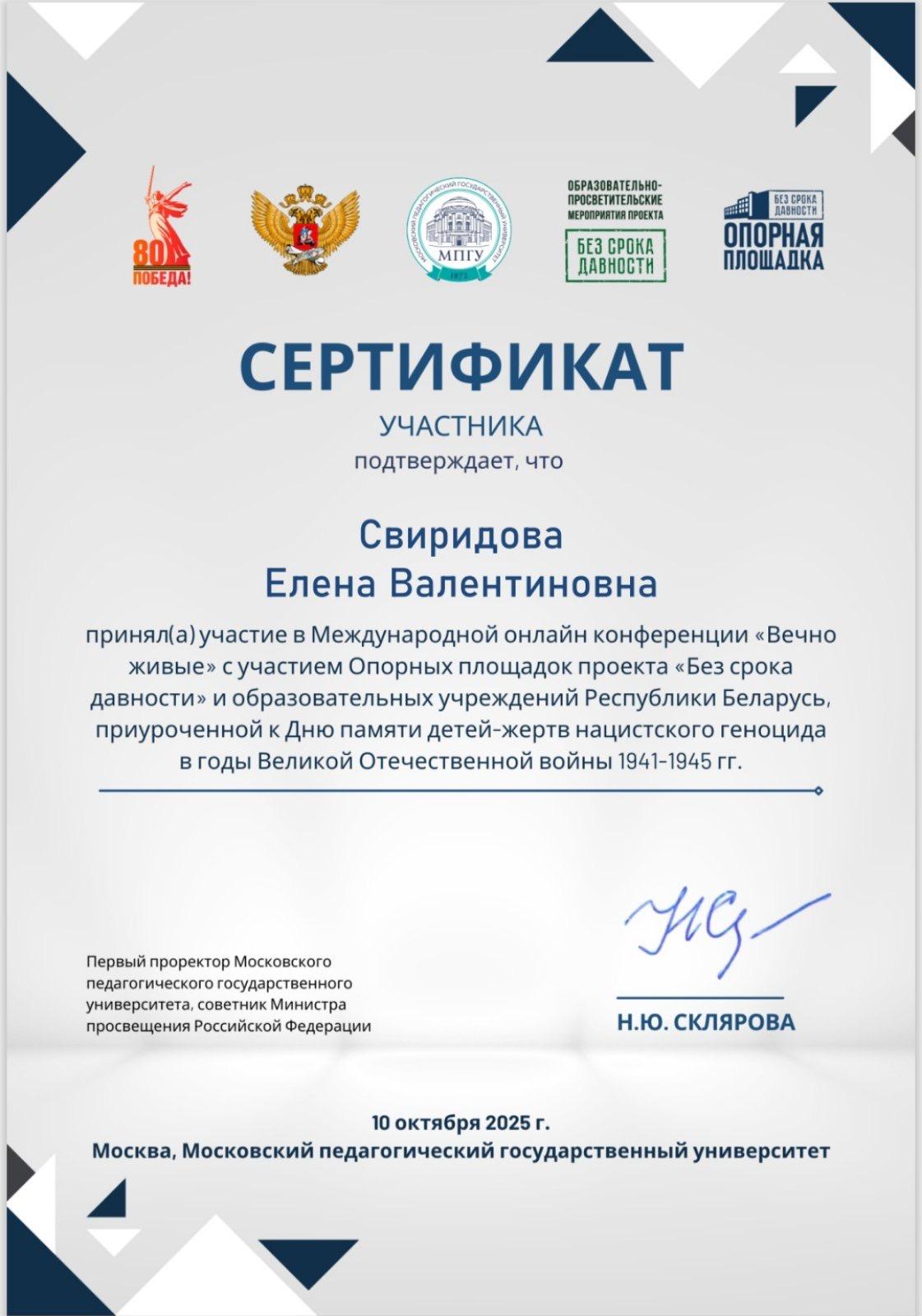 Благодарим Елену Валентиновну за активное участие в Международной онлайн-конференции «Вечно живые», представленный практический опыт и рекомендации по укреплению традиционных ценностей и сохранению исторической памяти.