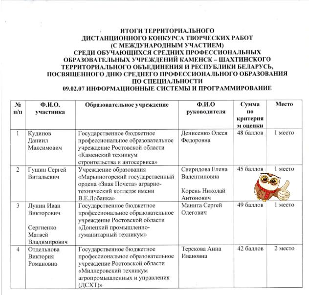 Подведены итоги международного дистанционного конкурса, посвященного Дню среднего профессионального образования