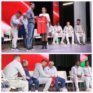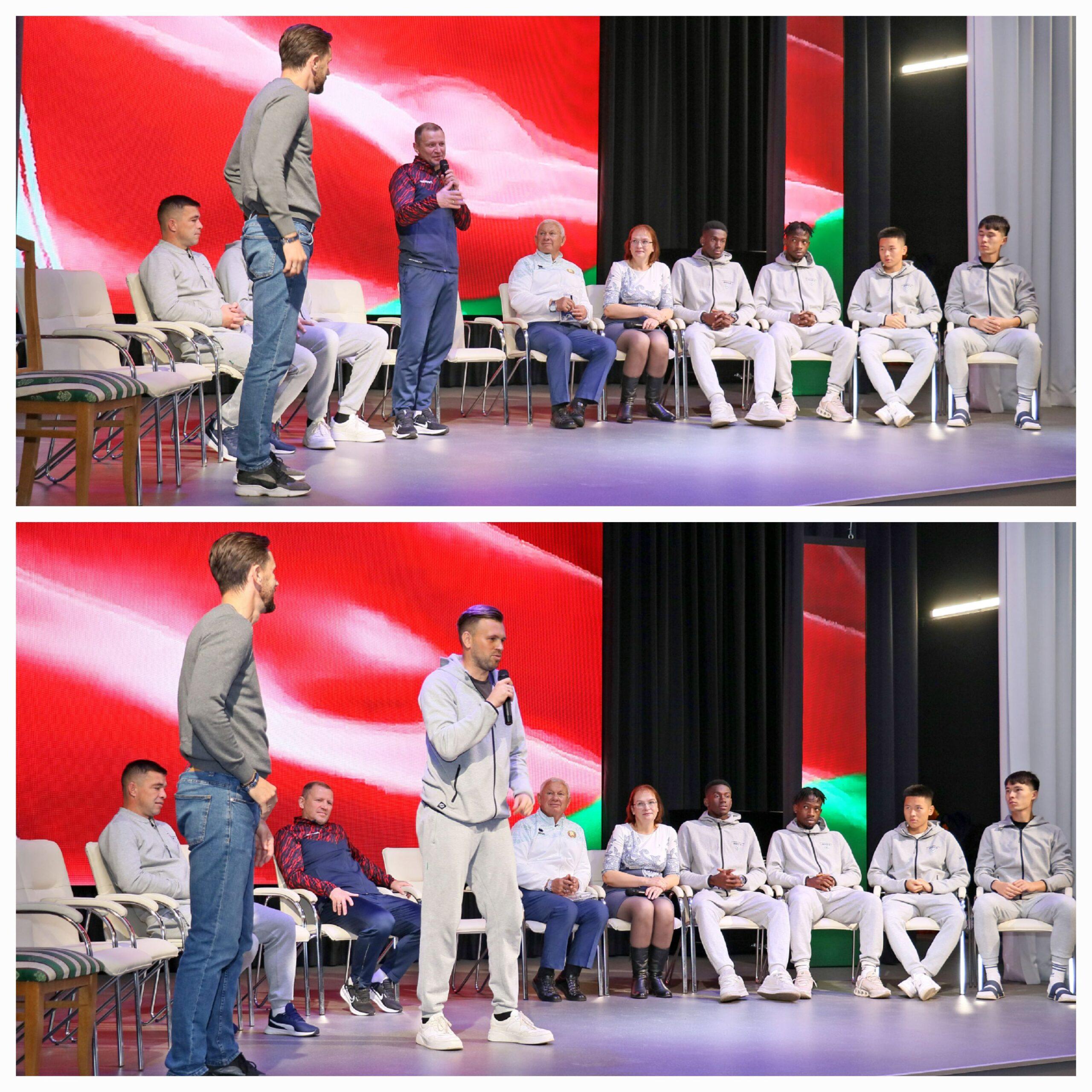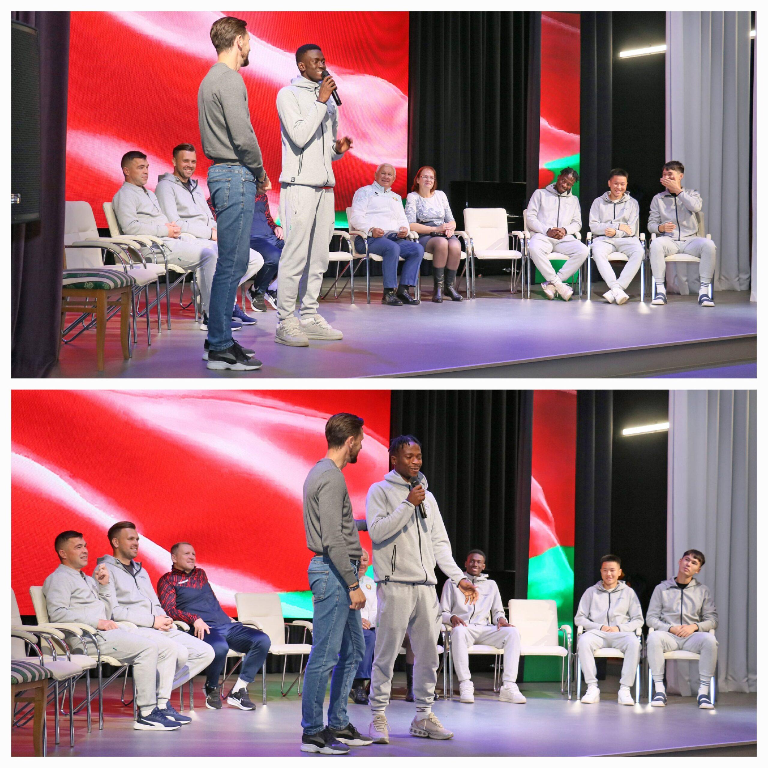 Руководитель народного музея истории учреждения образования Елена Свиридова познакомила присутствующих с непростой, но наполненной добрыми делами, судьбой Анатолия Ивановича. Директор ФК «Минск» Виталий Булыга рассказал о жизни футболистов. Главный тренер ФК «Минск» презентовал игроков. Учащиеся задавали самые разнообразные вопросы (наиболее интересные отмечены призами). Гости с вдохновением на них отвечали (иногда прибегая к помощи переводчика). Учащиеся получили в подарок футбольные м